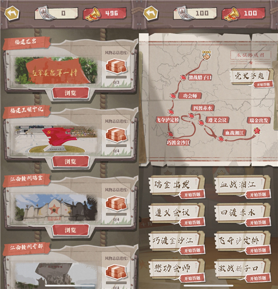 同时,《前进之路》也是一本关于长征的“百科全书”。游戏内嵌的风物志系统,将长征途中的标志性历史人文景观设计成可收集的拼图,鼓励玩家在游戏中深入了解这些重要地点的风貌特色与历史意义。另外,游戏中的长征问答、党史答题系统,也将历史知识的学习融合进玩家的游戏过程中,并设置通关奖品作为参与激励,让游戏在具备可玩性的基础上也兼备了红色教育的深度。